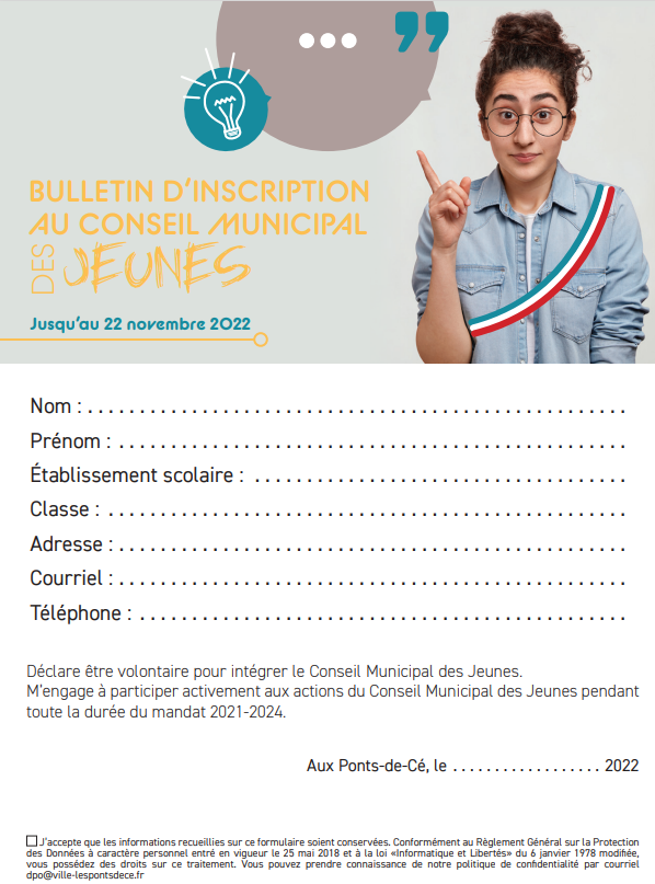 Il te suffit d’envoyer ta candidature à l’aide du formulaire ci-dessous à compléter et à envoyer : cmj@ville-lespontsdece.fr avant le 22 novembre 2022
