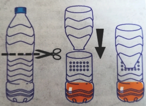 Prenez une bouteille en plastique vide coupée au tiers supérieur, et dont la partie haute sera placée à l’envers (et fixée par deux agrafes) pour faire entonnoir. Pour permettre aux petits insectes non ciblés de s’échapper, faites des petits trous (5 mm) avec un bout de fil de fer chauffé.