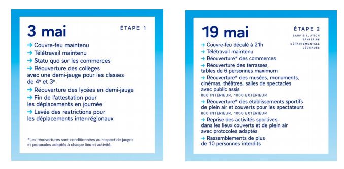 Le président de la République Emmanuel Macron a annoncé, dans un entretien à la presse régionale, un déconfinement en quatre étapes progressives, du 3 mai au 30 juin, conditionnées à la situation sanitaire dans chaque département.