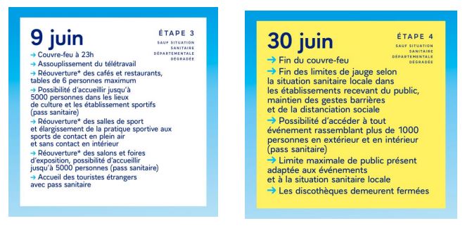 Couvre-feu repoussé à 21h et réouverture des commerces, terrasses, musées, salles de cinémas et théâtres avec des jauges limitées.