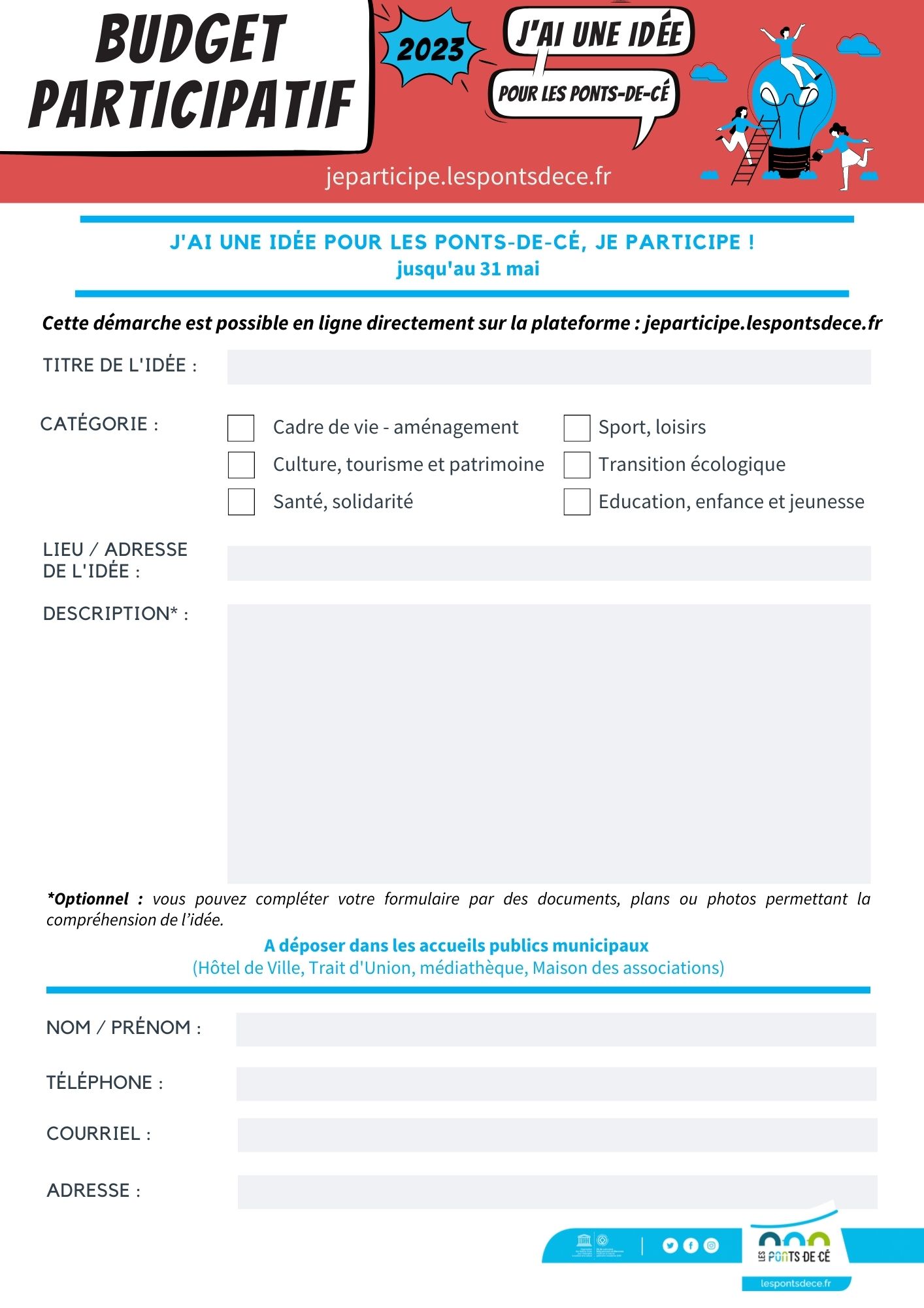 Les habitants sont invités à déposer leurs idées entre le 1er mars et le 31 mai soit sur la plateforme dédiée à la participation citoyenne « jeparticipe.lespontsdece.fr » ou soit par bulletin papier dans les accueils publics municipaux (Hôtel de Ville, Maison des associations, Trait d’Union, médiathèque).